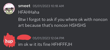 now for the screenshots of me saying “this is non-con” it was indeed a welcome home drawing, I will admit I did draw that, I don't think it was anything too explicit let's hope but I did ask if ‘hop’ was ok with it and they told me that they were completely fine with it.