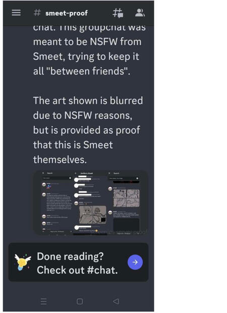 due to this, I must note most of them were minors. The one adult that was in there? 18. Someone near smeets age who tried to stop the conversation where it was. Also, I don't know about you but being pressured and convinced into giving said NSFW isn't something a 16-17 year old deals well with. Regardless of this, all of us who were involved in the groupchat, were in the wrong. And I was in the wrong for allowing such actions and creating the group the groupchat to begin with. I will be taking accountability for this.