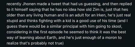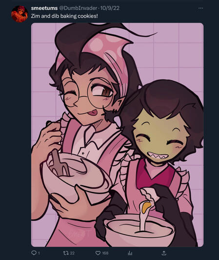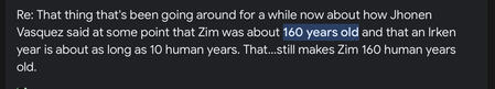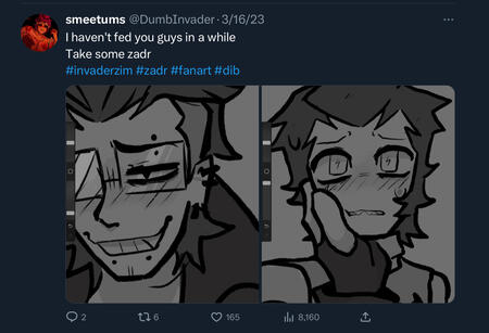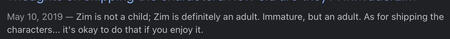 due to them being 14-15 I can give somewhat of a pass because not everyone is going to know how go draw people. Along with that, the people they associated with at the time were people that actively encouraged Smeet to make NSFW. They are no longer associated with these people. “Oh what about the art they liked between one of their characters and zim from invader zim? Zim's a minor!” I hear you say. Zim isn't a minor. The creator of invader zim has started he's not a minor (160 year's old) and isn't intended to be seen as one.